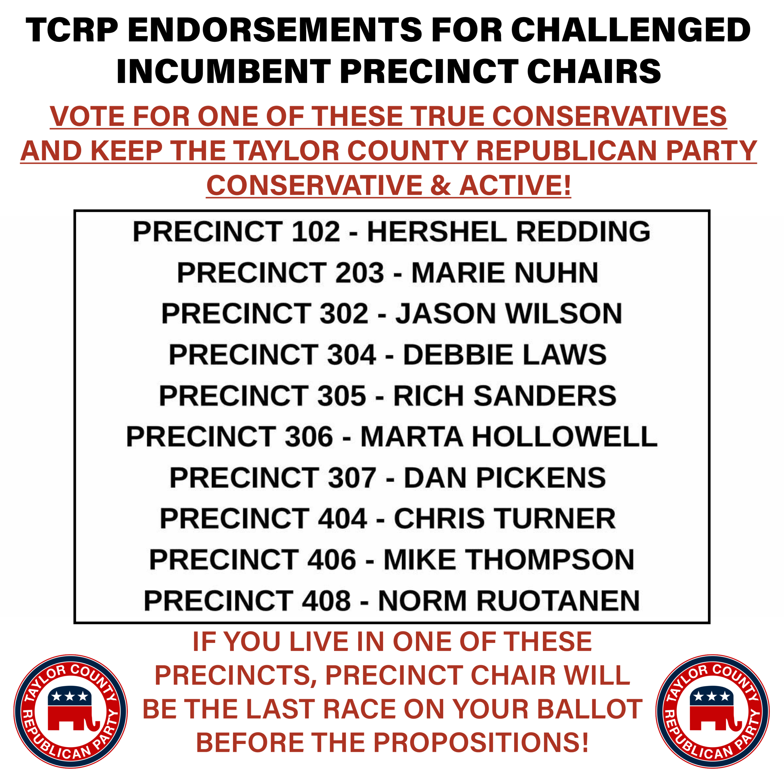 It seems that the simple act of CENSURING Stan Lambert, the State Representative who authored the Big Country hospital monopoly bill (COPA), has brought out Mr. Lambert's friends to run for Precinct Chair AGAINST our incumbent CONSERVATIVE TCRP Precinct Chairs! For this reason, TCRP is ENDORSING OUR PRECINCT CHAIRS LISTED BELOW in this race, who we believe best represent the TRUE CONSERVATIVE GRASSROOTS VALUES of the BIG COUNTRY!