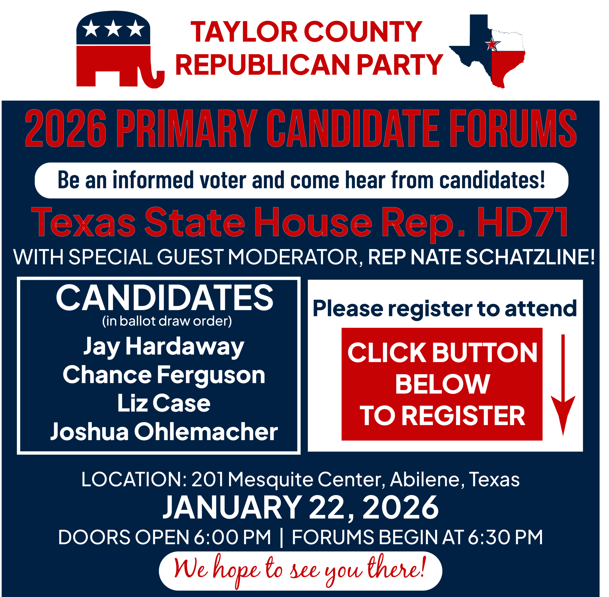 During Republican Primaries, Taylor County Republican Party attempts to equally and fairly promote all local Republican candidate events of which we are aware. No endorsement by the Taylor County Republican Party is implied by a candidate’s event being displayed on this calendar.